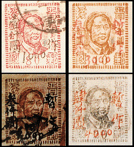 1948.7。晋绥边区邮政管理局。石印加盖。第一版毛泽东像邮票。100(20*5)。西北农民币。