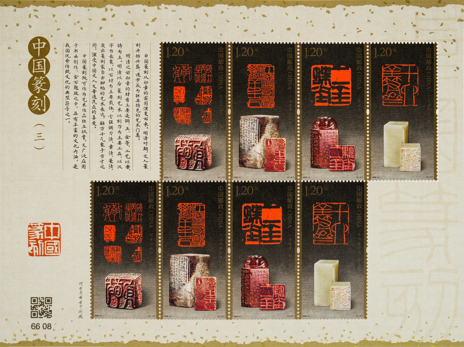 中国邮政2026年4月20日发行《中国篆刻(三)》特种邮票1套4枚。